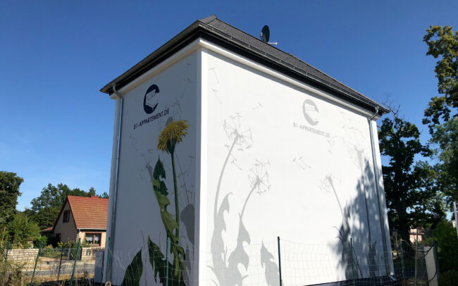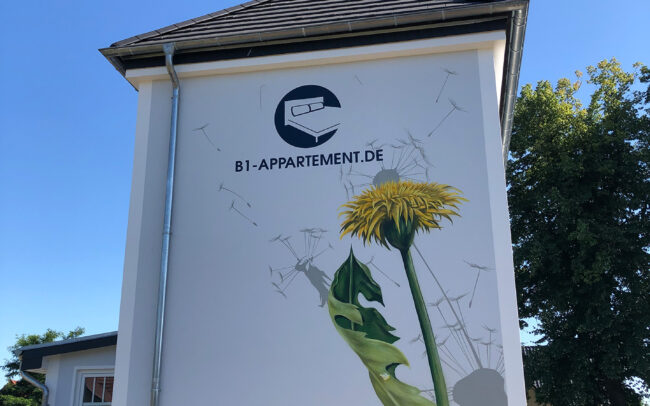 Für B1-Appartement haben wir bereits mehrere Fassaden mit detailreichen Löwenzahn-Motiven gestaltet. In der Verbindung mit dem Unternehmenslogo wird die Wandmalerei zur lebendigen Visitenkarte und schafft im öffentlichen Raum eine klare Wiedererkennung.