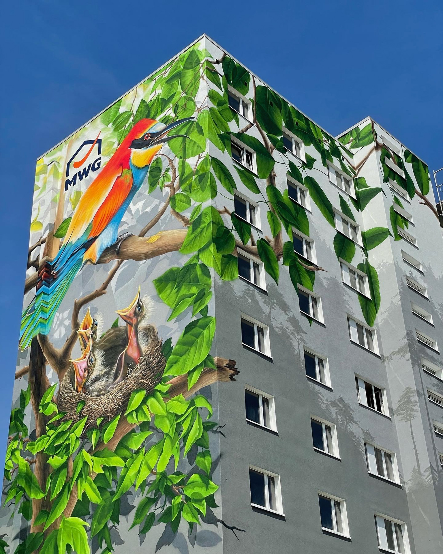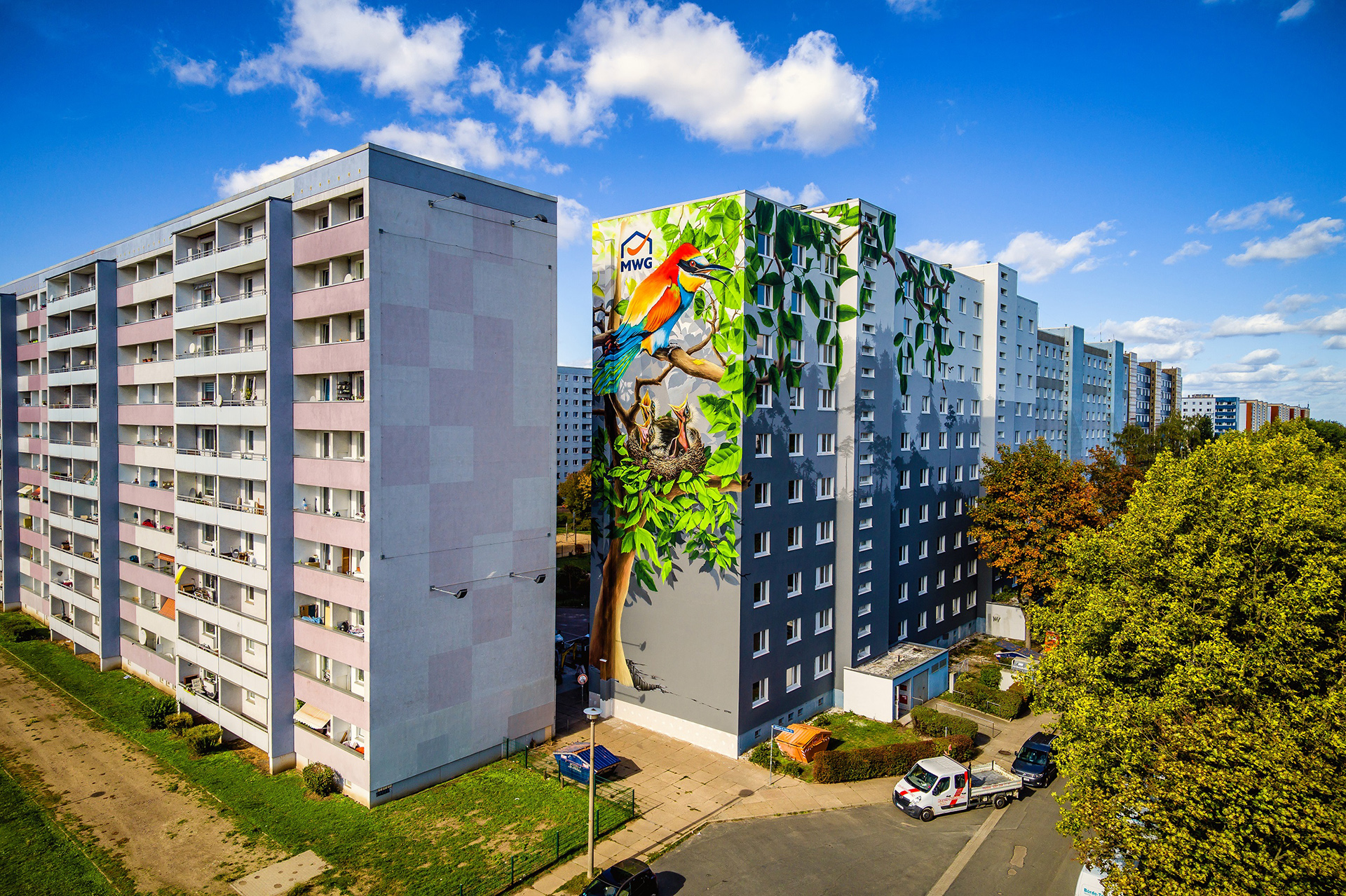 Wir haben in der Otto-Nagel-Straße im Magdeburger Stadtteil Kannenstieg eine Fassade neu gestaltet. Das farbenfrohe Wandgemälde mit Vogel und Nest macht das Baumkronenhaus schon von außen zu einem besonderen Ort, der weit über den Stadtteil hinaus Aufmerksamkeit weckt. Das neue Wandbild ist für uns nicht nur Kunst am Bau, sondern auch ein Symbol für lebendige Stadtgestaltung.
